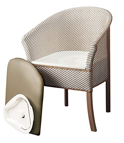 A wooden frame commode with woven fibre upholstery in white and gold. The potty has a lid and carrying handle. The high chair sides, provide support when rising or lowering. Width between arms (at top) 530 mm, seat height 470 mm, seat width 440 mm, seat depth 440 mm, backrest height 775 mm, weight 7.2 kg. Maximum user weight 160 kg