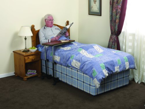 The overbed table is versatile. It can assist eating tasks such as resting a drink, eating a meal in front of the TV or enjoying a leisurely breakfast in bed. It can help keep objects like a telephone or reading glasses close to hand and out of the way of damage. The table also tilts to 45 degrees so you can use it to hold a book or magazine at the angle for reading. When flat, it makes the surface for hobbies such as jigsaw puzzles and board games. It features integral ridges on the table edges which restrict any spillage and stop objects such as pens from rolling off.