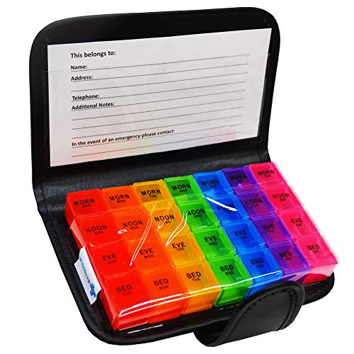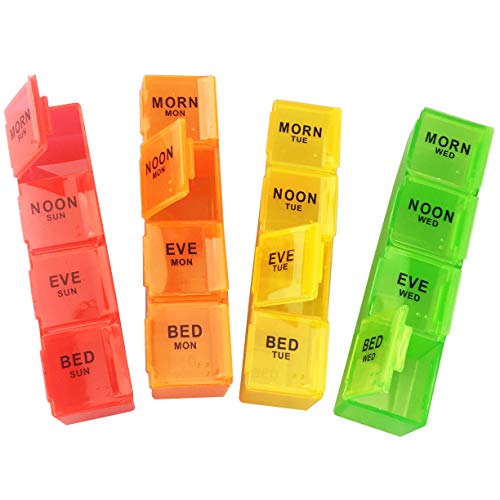 JFA Medical Weekly Small Travel Pill Box Organiser/Reminder for Medicines Supplements, Vitamins, 7days, 4 compartments per Day – Morning, Noon, Evening and Bed.